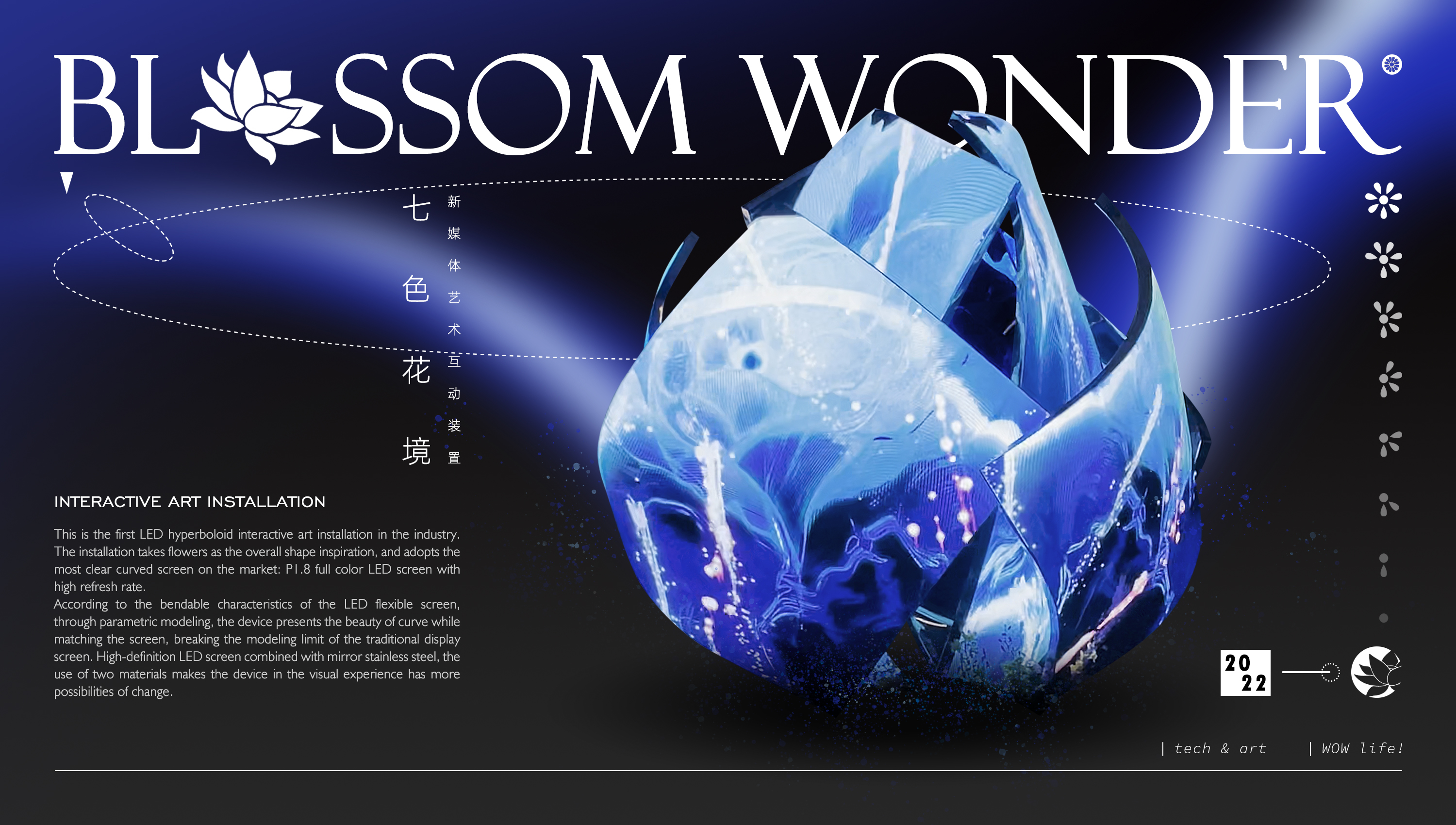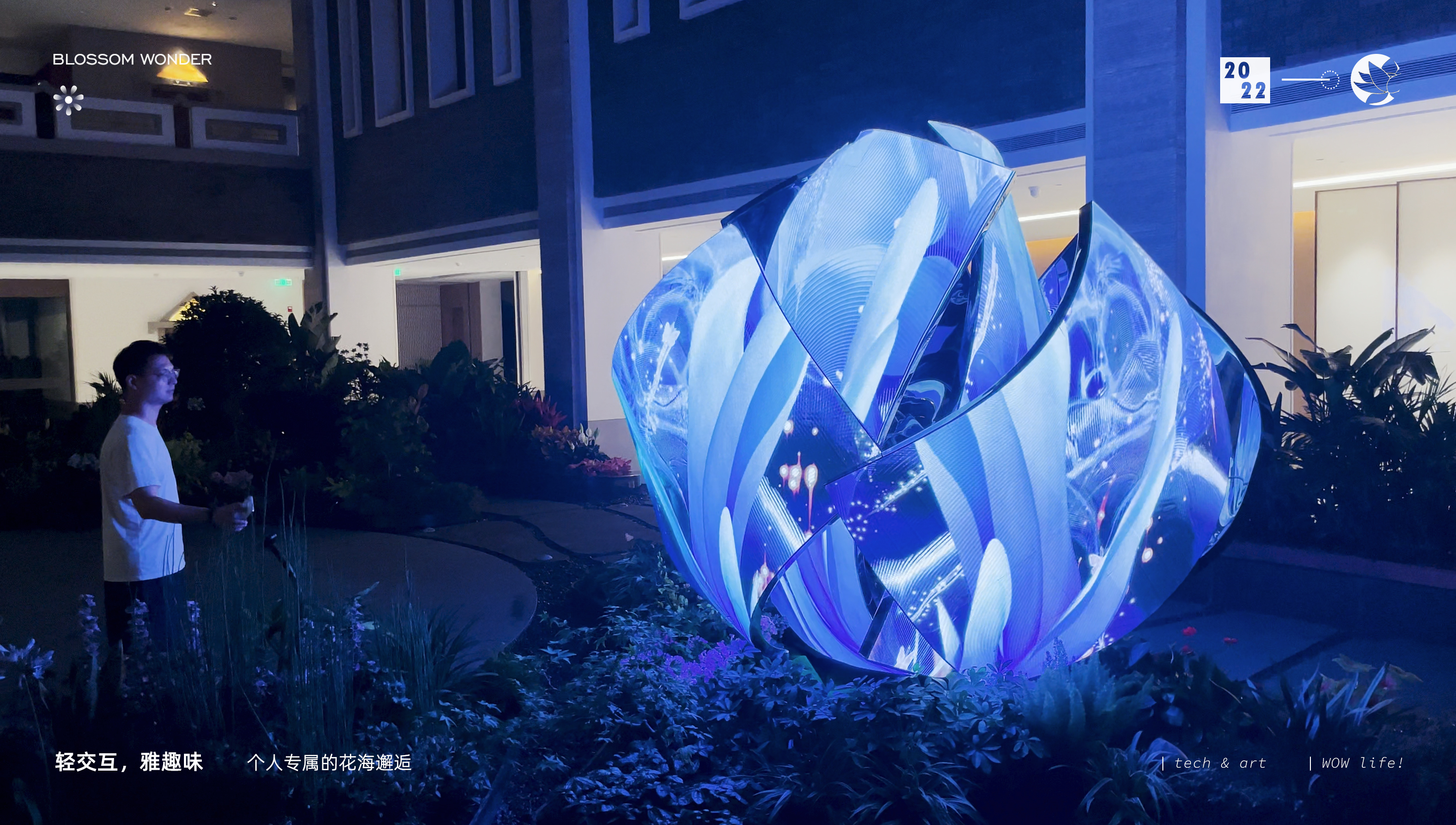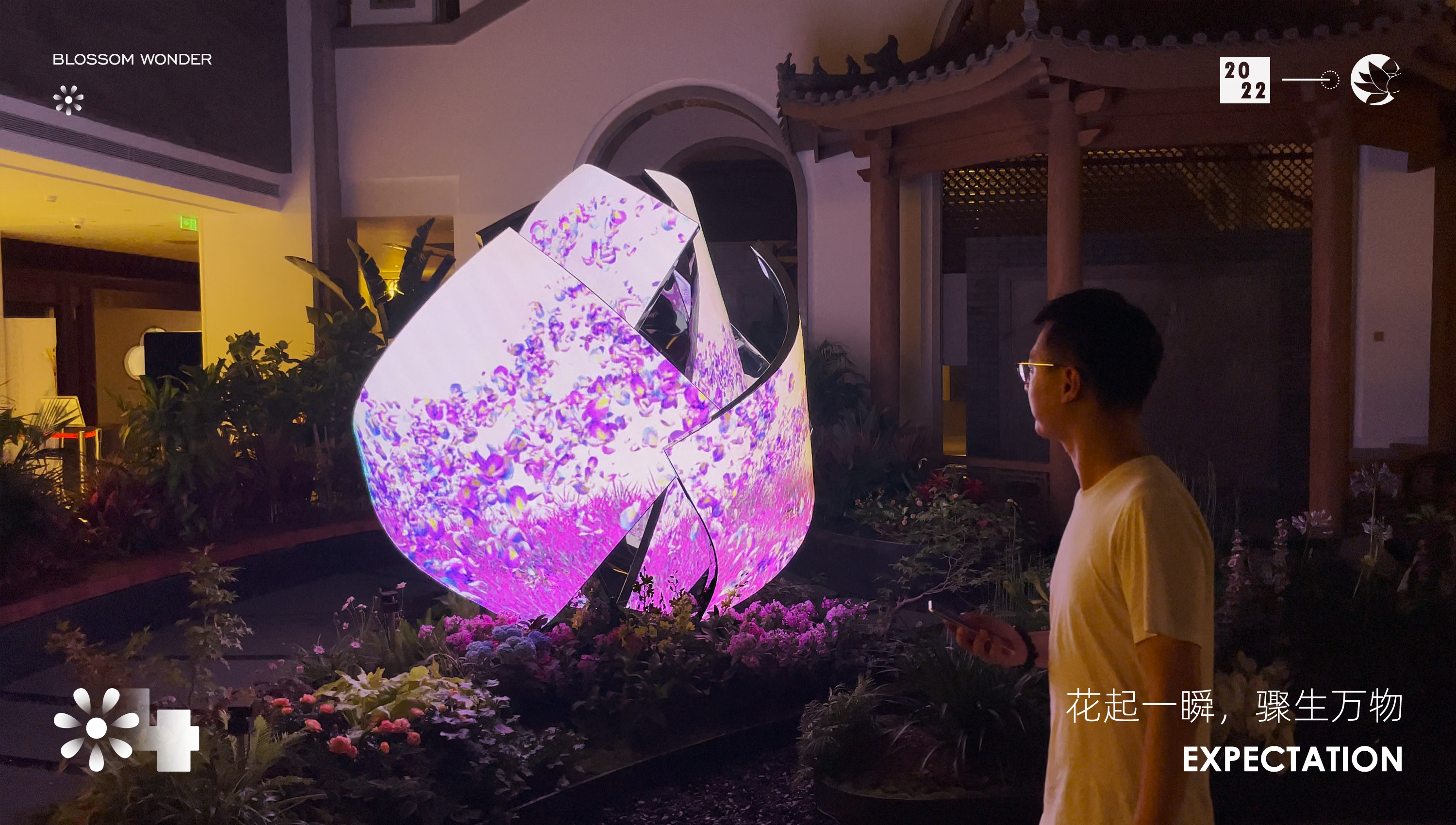整个装置以“花”作为整体造型的灵感,利用超高清LED柔性屏的特性创造全球首款双曲面led展示手法,通过有机参数化建模,打破了传统显示屏规则形状的限制,创造出动态而富有韵律的曲线弧度,使显示内容更灵活多样。结合全域环绕音场、自然疗愈声效等的应用,为用户呈现了一个多维度、多感官的艺术自然疗愈场域。