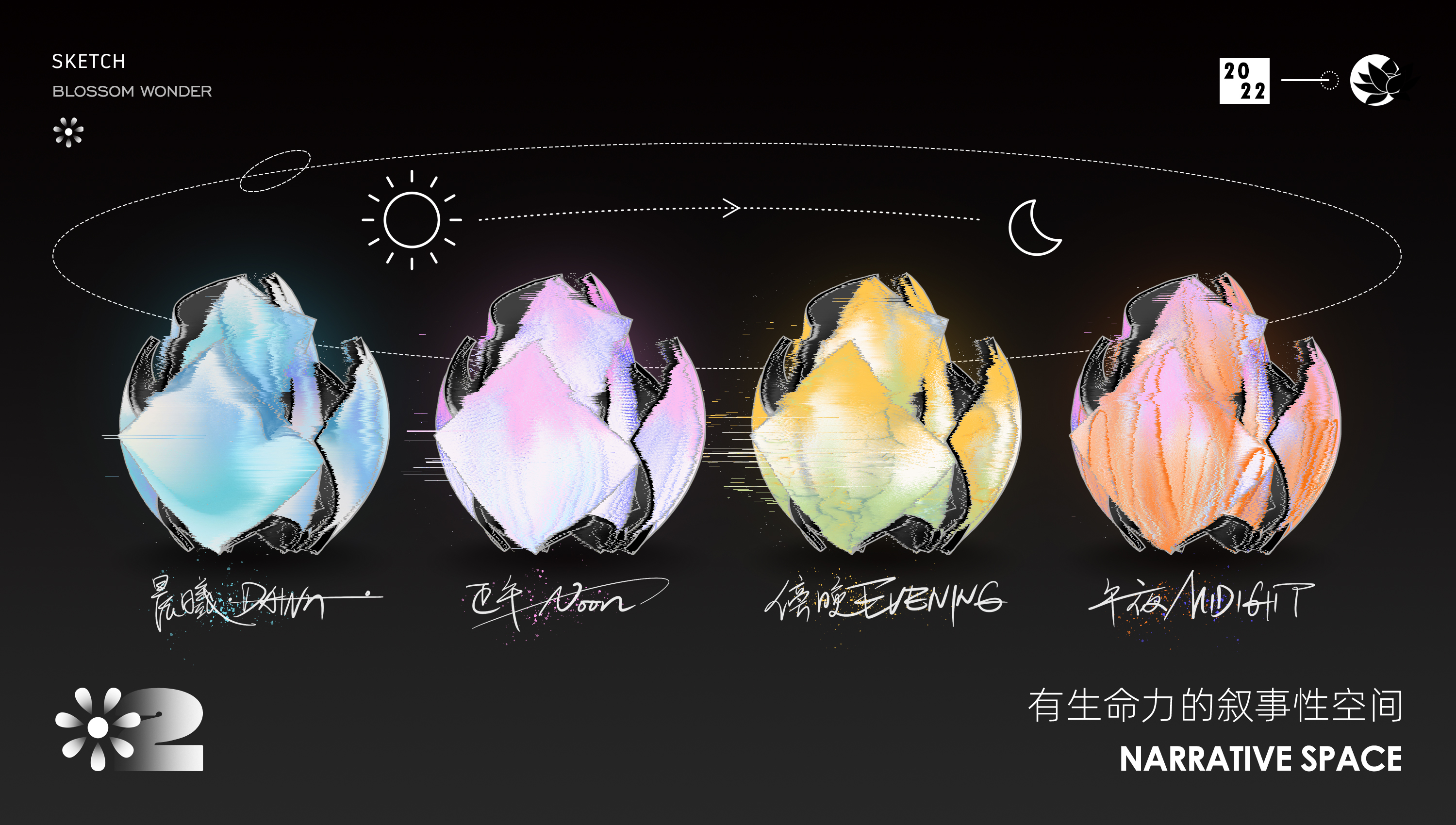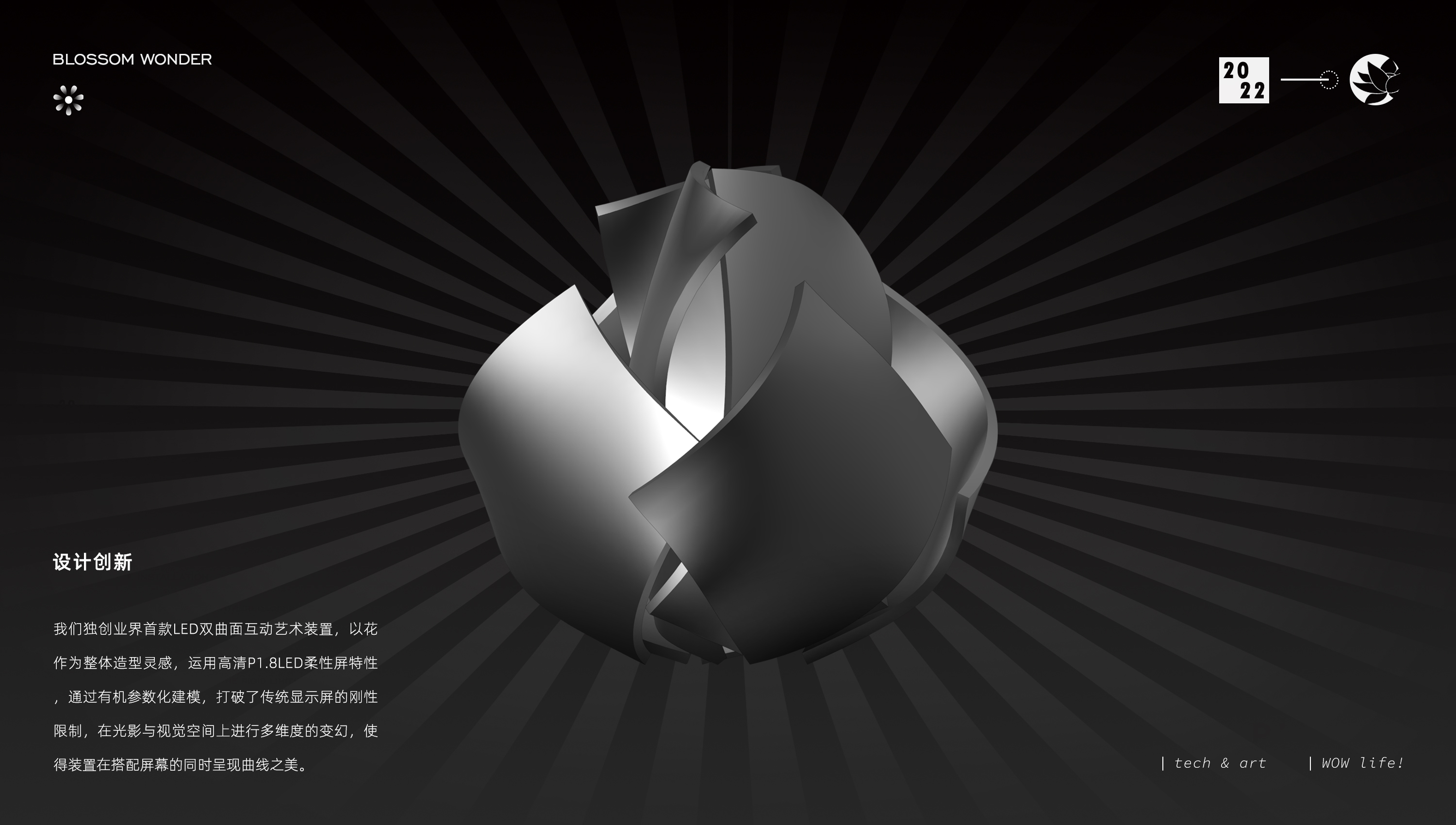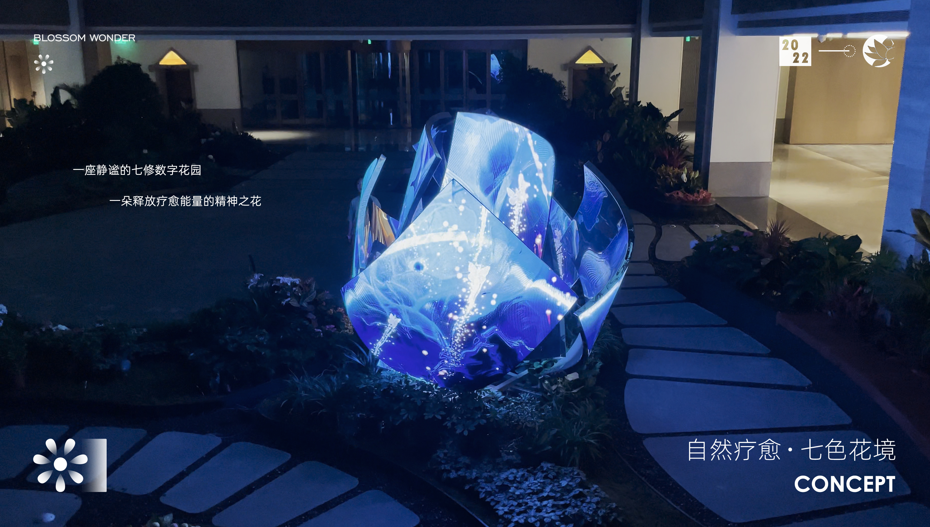 整个装置以“花”作为整体造型的灵感,利用超高清LED柔性屏的特性创造全球首款双曲面led展示手法,通过有机参数化建模,打破了传统显示屏规则形状的限制,创造出动态而富有韵律的曲线弧度,使显示内容更灵活多样。结合全域环绕音场、自然疗愈声效等的应用,为用户呈现了一个多维度、多感官的艺术自然疗愈场域。