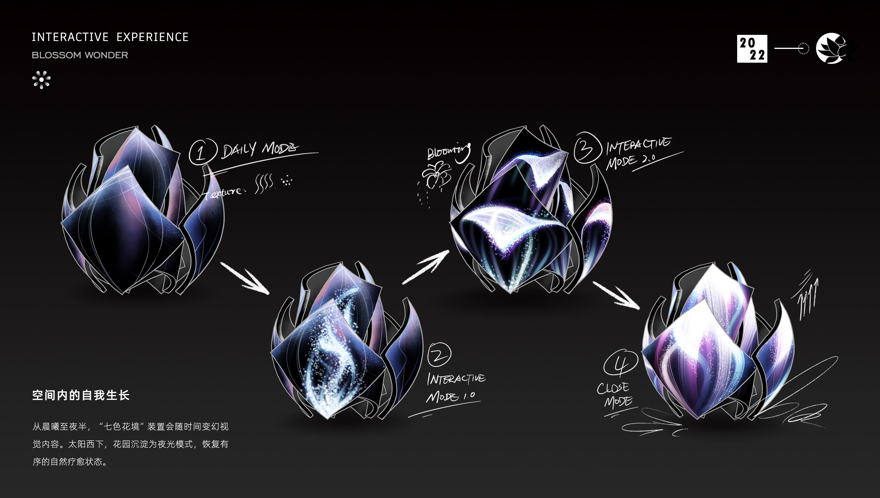 项目以 “花修” 理念为基础,完美融合了数字创意与现实场景,为传统的自然花园引入了新的智慧生态。同时,也展现出植物与花卉的自然生命力,并通过其生命讯息和能量的传递,感染人心,让每个体验的用户都能从中获得治愈。