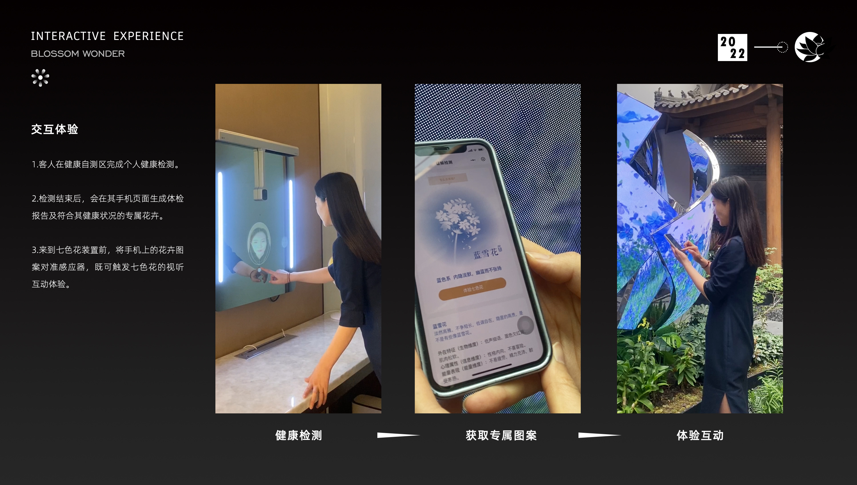 交互设计作为本装置的核心亮点,建立起七色花与游客行为、心境之间的联系。团队选取 “花修” 理念中的七种花(玫瑰,萱草,翠菊,牵牛花,紫藤花,丹桂,蓝雪花)作为艺术化表达的媒介,并反映不同的情绪和健康状态——用户完成与产品的交互后,会在手机端生成专属花卉,将其对准装置感应器,属于游客个人的花卉会在屏幕中央呈现、舒展、绽放,映射出游客当下的心境,并通过舒适活动环境的营造,给予游客专属的心灵疗愈功效。