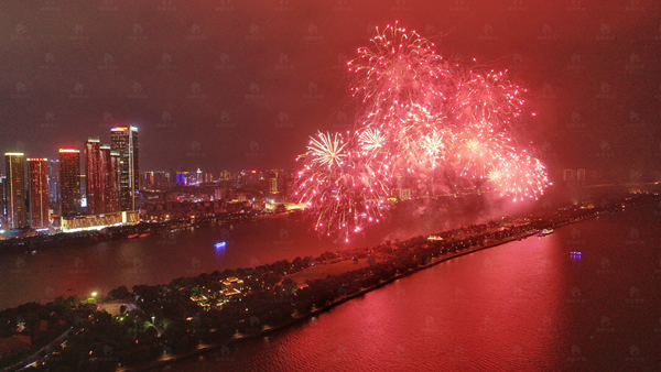 (航拍视角下的橘子洲烟花。星辰全媒体记者 覃翊 摄制)