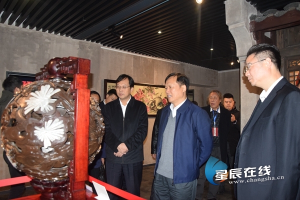 (湖南省文化和旅游厅党组书记、副厅长禹新荣(前右二),长沙市委常委、宣传部长高山(前左一)等在馆内了解长沙非遗手工艺。)