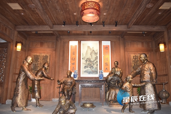(家堂展现的是一组雕像,表现了民国时期长沙一户人家四世同堂过年的热闹场景。)