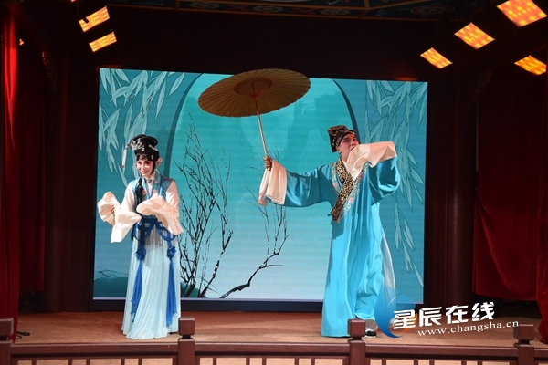 (位于副楼的戏园正在上演湘剧高腔《抢伞》。)