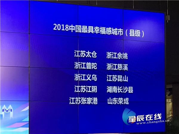 长沙县获评2018年中国最具幸福感城市县级市。与长沙县一起被推选为“2018中国最具幸福感城市县级市”的还有江苏太仓、浙江余姚、浙江普陀、浙江慈溪、浙江义乌、江苏昆山、江苏江阴、江苏张家港、山东荣成。