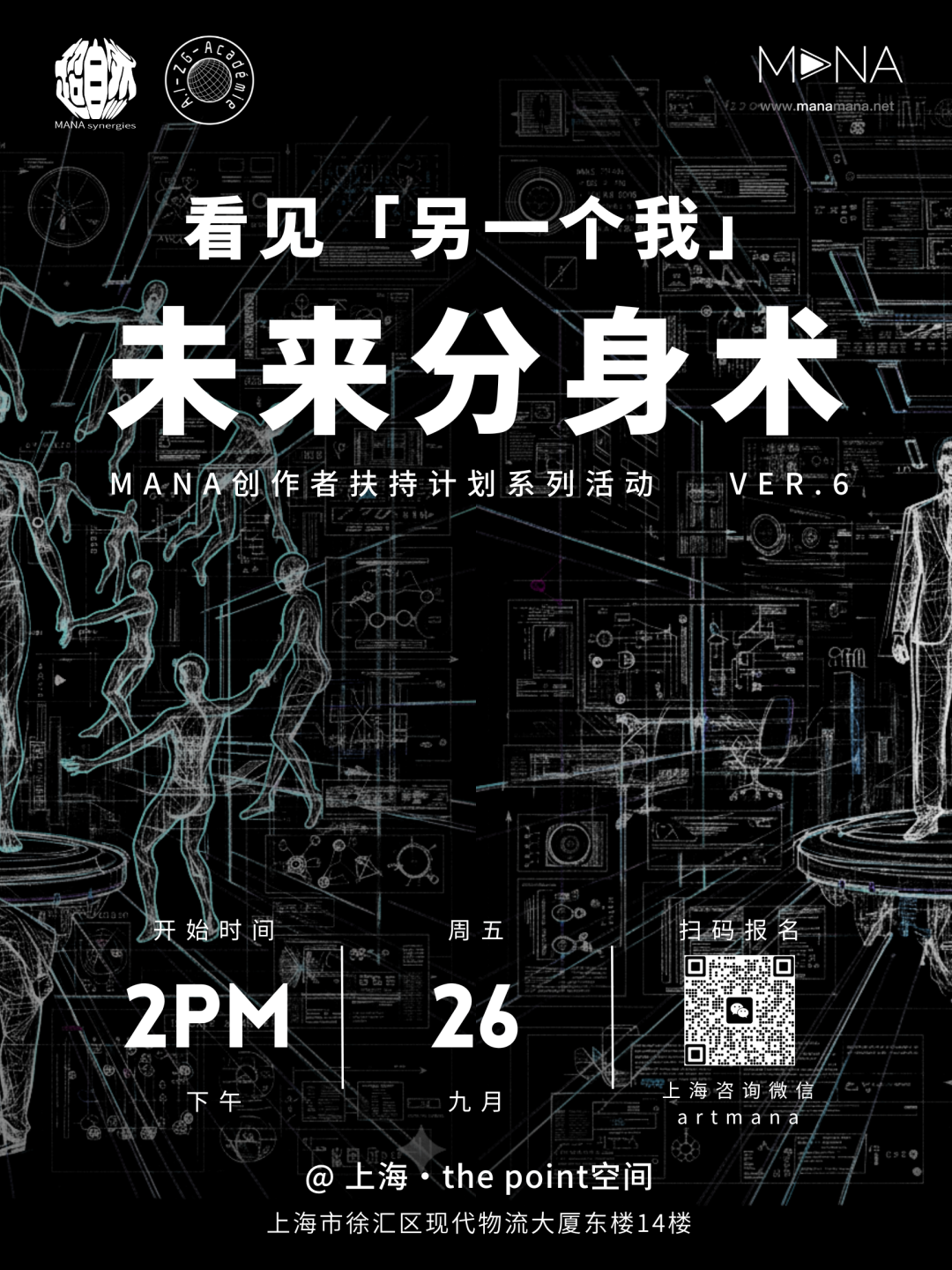 本次 “看见另一个我·未来分身术” 主题活动,由MANA全球新媒体艺术平台、上海市新阶层科创服务团、上海市新阶层专业服务团联合主办,“文化艺术+媒体科技”,合作方北京澜景科技、上海快来秀展示科技、上海外国语大学贤达经济人文学院数字光线教研中心、南京巨阵文化科技公司、苏州歇马桥文旅投资、南京AI智谷研究院艺术中心……(每场活动近20家机构&企业参与合作深度互动。)