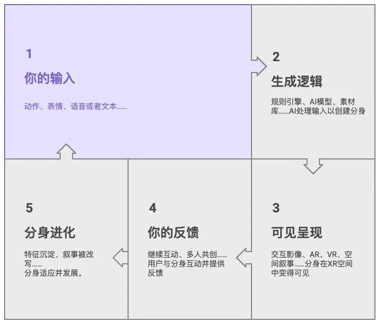 一句话:用生成式算法 + 交互影像 + 交互装置 + XR 空间,把“另一个我”做成可进入、可对话、可进化的体验。