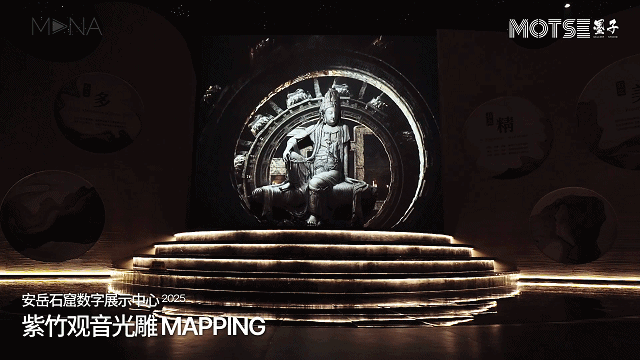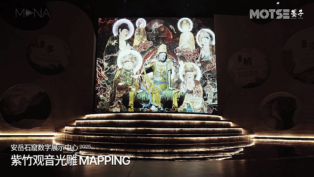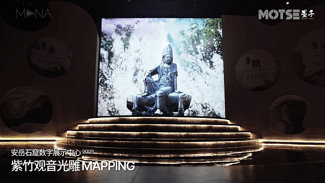 安岳石窟数字展示中心A馆占地约975平方米,MOTSE墨子作为项目策展设计与实施统筹,通过数字演绎与空间叙事,探索石窟艺术数字化的创新表达,以现代视角重述千年文脉肌理。