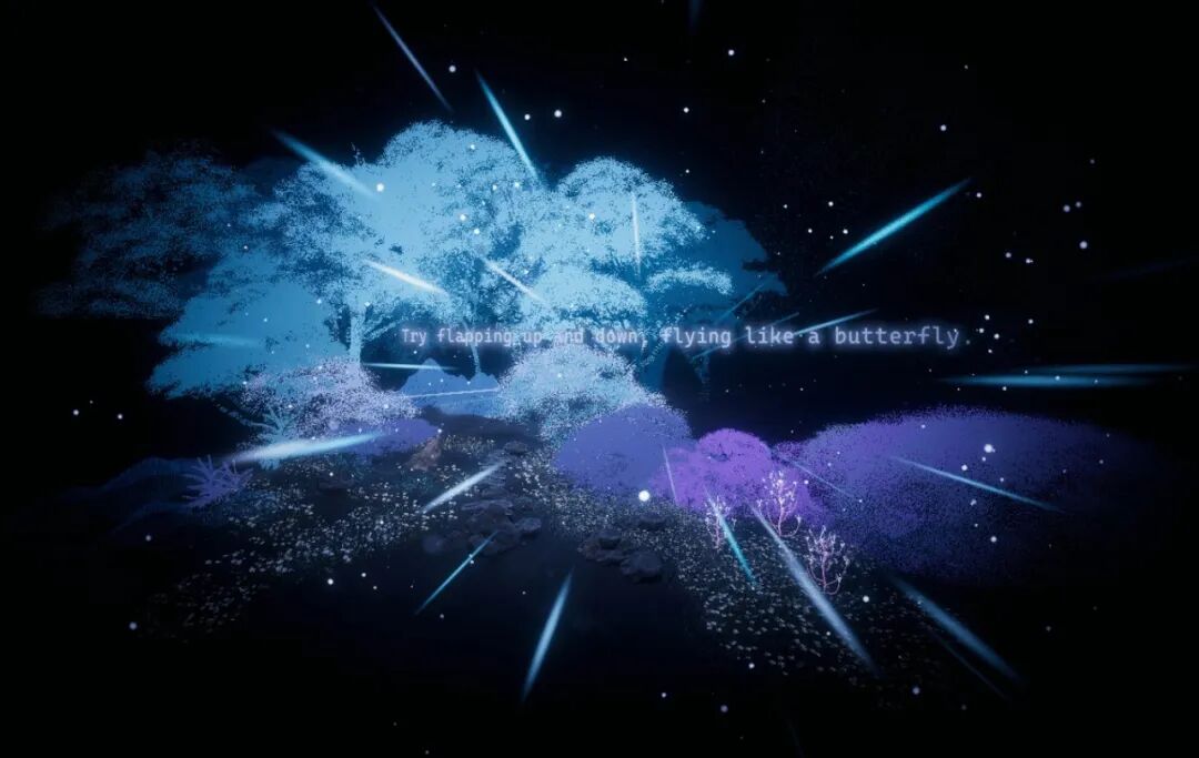 自然交互VR体验项目《穿越感官》是一个让体验者以非人类群体视角体验世界的作品。 戴上头显你会加入一群发着微光的蝴蝶,从它们的色域角度去看森林——视野不再是人的视野,而是一种更细碎、更轻盈、更广阔的角度。你会从蝴蝶的角度、蝴蝶的节奏里,看到一个完全不同的世界——这是一段属于“非人类”的自由旅程。