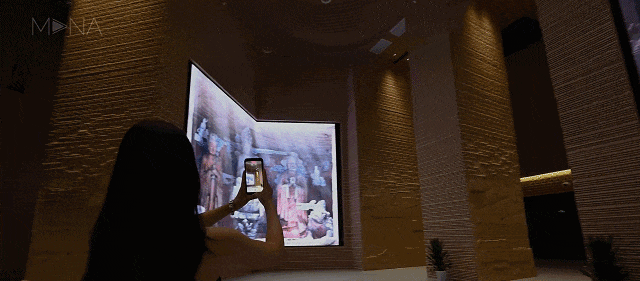 紫竹观音光雕投影位于展馆开篇,将审美意象化为「光影」之景,通过复刻实物雕塑与3D Mapping光雕技术的结合,带领观者穿越千年光阴,看时光之粒将风化残损的画面渐渐修复完整,石窟中的绚烂瑰宝再次浮现。
