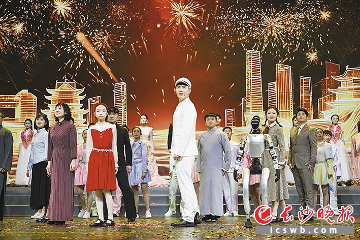 诗乐会以“序幕:苍茫大地·星火启程”“第一幕:百舸争流·信仰丰碑”“第二幕:万山红遍·此刻长沙”“尾声:风华正茂·青春以歌”为脉络,综合运用情景表演、声乐、舞蹈、湘剧戏歌、朗诵等多种文艺门类和3D视频、AI互动、机器人等科技手段,让观众在时空流转中感受信仰的力量与时代的变迁。