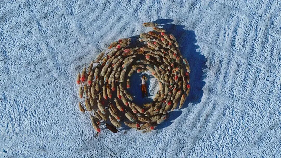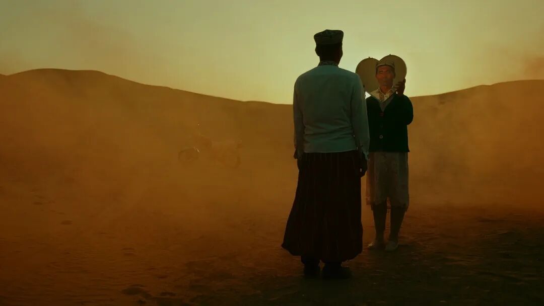 这种“沉浸式创作”的哲学,贯穿了熊超的所有作品。为了拍摄《美好》,他和团队飞了八个小时赶赴和田,在大巴扎偶遇十指相扣的维吾尔族老年夫妇,记录下他们骑破旧摩托车穿越金色杨树林、用心形镜子倒映出爱意脸庞的画面;在街巷里拍到当地孩童把磨损的篮球当作足球追逐嬉戏,定格下与敦煌壁画中唐代《蹴鞠图》文化基因一脉相承的鲜活场景;甚至在昆仑山突降的大雪里,捕捉到羊群自动环绕吹长号少年、在雪地上划出同心圆的“神迹瞬间”。